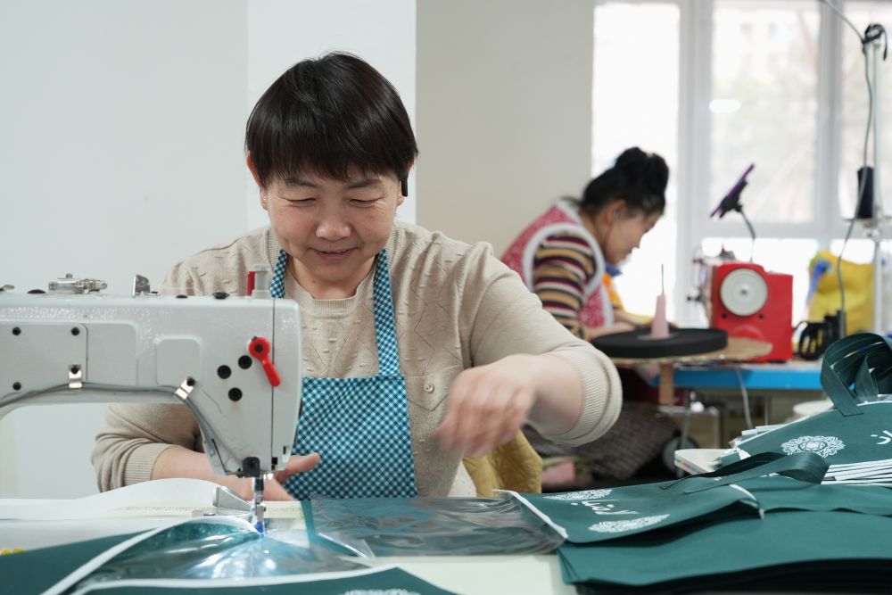2025年3月27日,回遷居民在雄安新區(qū)“雄業(yè)創(chuàng)工坊”包裝工坊加工無紡布。工坊引入有持續(xù)發(fā)展?jié)摿Α?duì)社區(qū)環(huán)境影響較小的產(chǎn)業(yè),為回遷群眾提供靈活多樣的就業(yè)崗位,讓回遷居民實(shí)現(xiàn)“上樓安家,下樓就業(yè)”。