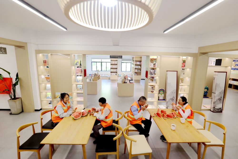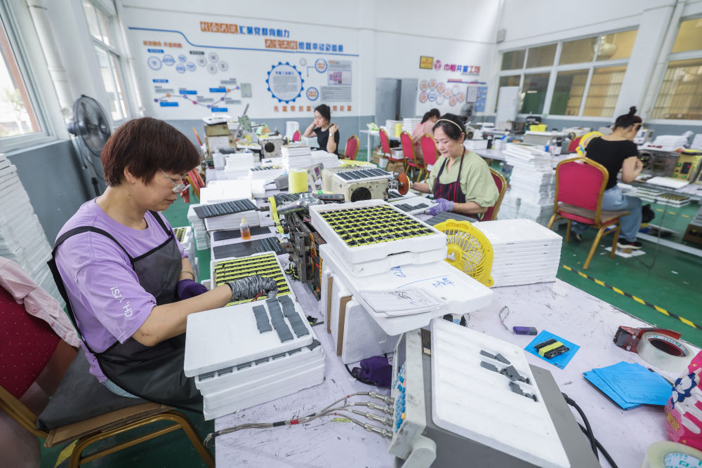 2025年6月19日,村民在浙江省海寧市鹽官鎮(zhèn)桃園村紅“芯”共富工坊內(nèi)工作。該共富工坊針對(duì)有靈活就業(yè)需求的低收入村民,采用“靈活就業(yè)+固定用工”彈性用工方式,促進(jìn)群眾就業(yè)增收。