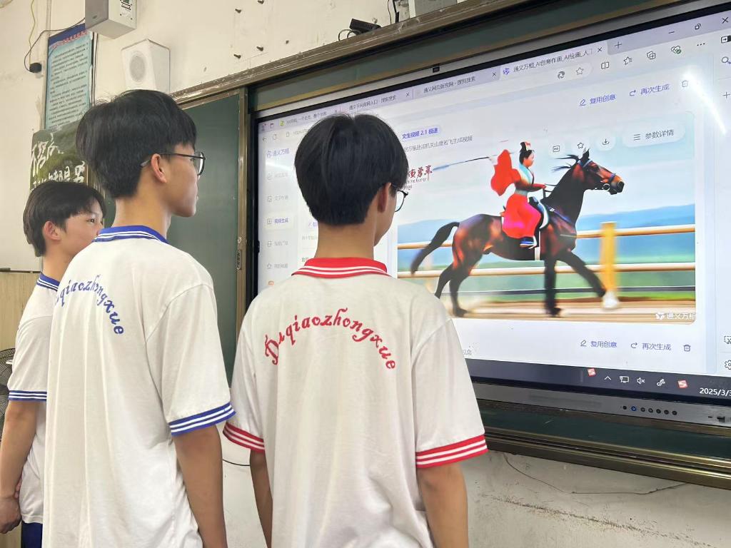 3月3日,廣西容縣容州鎮(zhèn)都嶠中學(xué)學(xué)生觀看老師使用人工智能大模型生成的海報(bào),感受語(yǔ)文課堂的互動(dòng)創(chuàng)新。(陳春仲 攝)