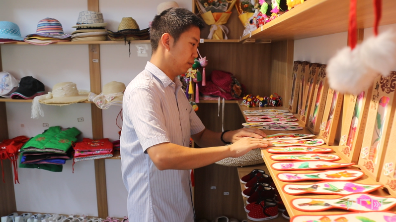 從外地返鄉(xiāng)的“90后”扶銀廷和妻子,在田鋪大塆創(chuàng)辦了一家“文創(chuàng)工坊”。“像鞋墊、虎頭枕、虎頭帽這些手工制品,都是我們當(dāng)?shù)匾恍├先?、大姐手工做的。這些特色的文創(chuàng)產(chǎn)品既能讓游客了解當(dāng)?shù)乇就廖幕衷黾恿舜迕袷杖??!狈鲢y廷說(shuō)。