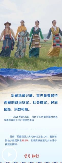 2025年8月20日,習(xí)近平總書記率中央代表團(tuán)乘專機(jī)抵達(dá)拉薩,出席西藏自治區(qū)成立60周年慶?;顒?dòng)。在聽(tīng)取西藏自治區(qū)黨委和政府工作匯報(bào)時(shí),習(xí)近平總書記強(qiáng)調(diào),“持續(xù)深入抓好穩(wěn)定、發(fā)展、生態(tài)、強(qiáng)邊四件大事,努力建設(shè)團(tuán)結(jié)富裕文明和諧美麗的社會(huì)主義現(xiàn)代化新西藏”。