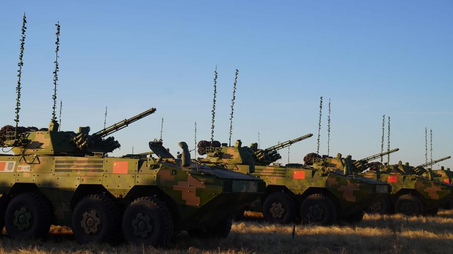 2021年9月20日,在俄羅斯奧倫堡州東古茲靶場(chǎng)舉行的“和平使命-2021”上海合作組織聯(lián)合反恐軍事演習(xí)開幕式上,中方參演部隊(duì)接受檢閱。新華社記者梅世雄攝