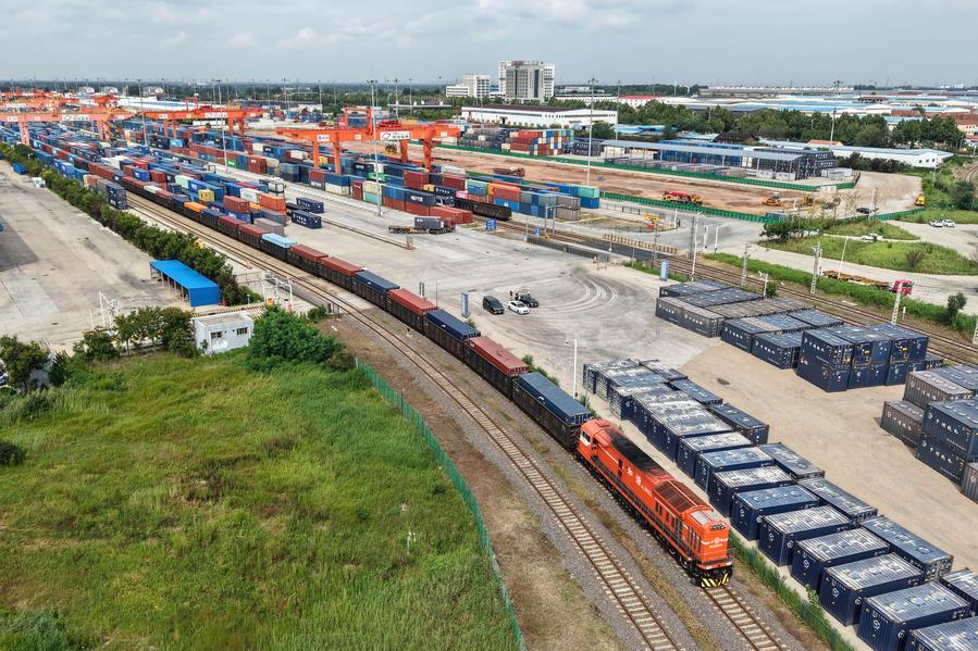 8月27日,一列貨運(yùn)列車駛?cè)胛挥谏虾鲜痉秴^(qū)內(nèi)的中國(guó)-上海合作組織地方經(jīng)貿(mào)合作示范區(qū)多式聯(lián)運(yùn)中心(無(wú)人機(jī)照片)。新華社記者李紫恒攝