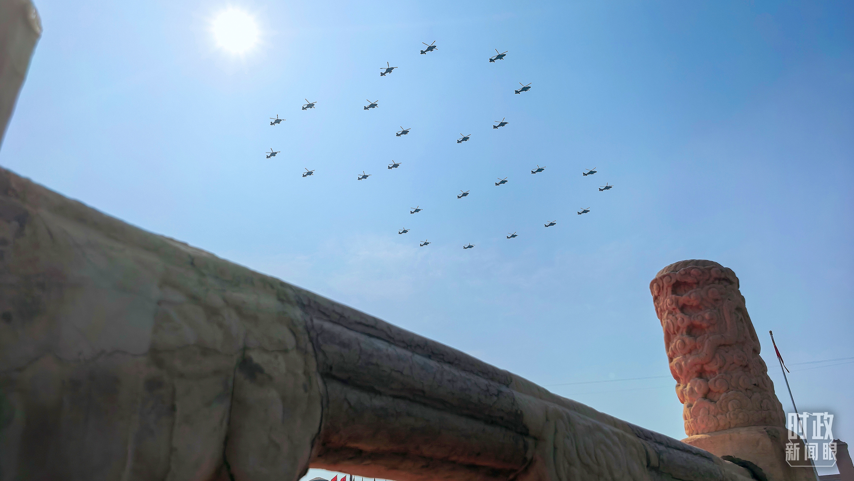 空中護(hù)旗梯隊(duì)率先亮相分列式環(huán)節(jié),26架直升機(jī)組成巨大的“80”字樣。教練機(jī)梯隊(duì)拉出14道彩煙,向中華民族14年可歌可泣的抗戰(zhàn)歷程致敬,向14億多中國人民奔向強(qiáng)國復(fù)興的不懈奮斗致敬。