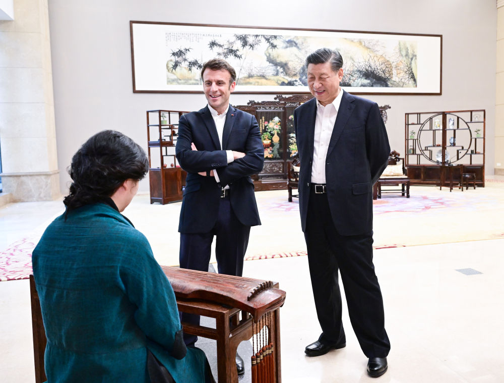 2023年4月7日,國(guó)家主席習(xí)近平在廣東省廣州市松園同法國(guó)總統(tǒng)馬克龍舉行非正式會(huì)晤。這是兩國(guó)元首在白云廳欣賞古琴演奏。新華社記者 岳月偉 攝
