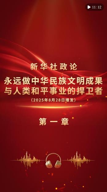 新華社8月28日播發(fā)《新華社政論|永遠(yuǎn)做中華民族文明成果與人類和平事業(yè)的捍衛(wèi)者——寫在中國人民抗日戰(zhàn)爭暨世界反法西斯戰(zhàn)爭勝利80周年之際》。我們邀請誦讀嘉賓任志宏演播“第一章”。