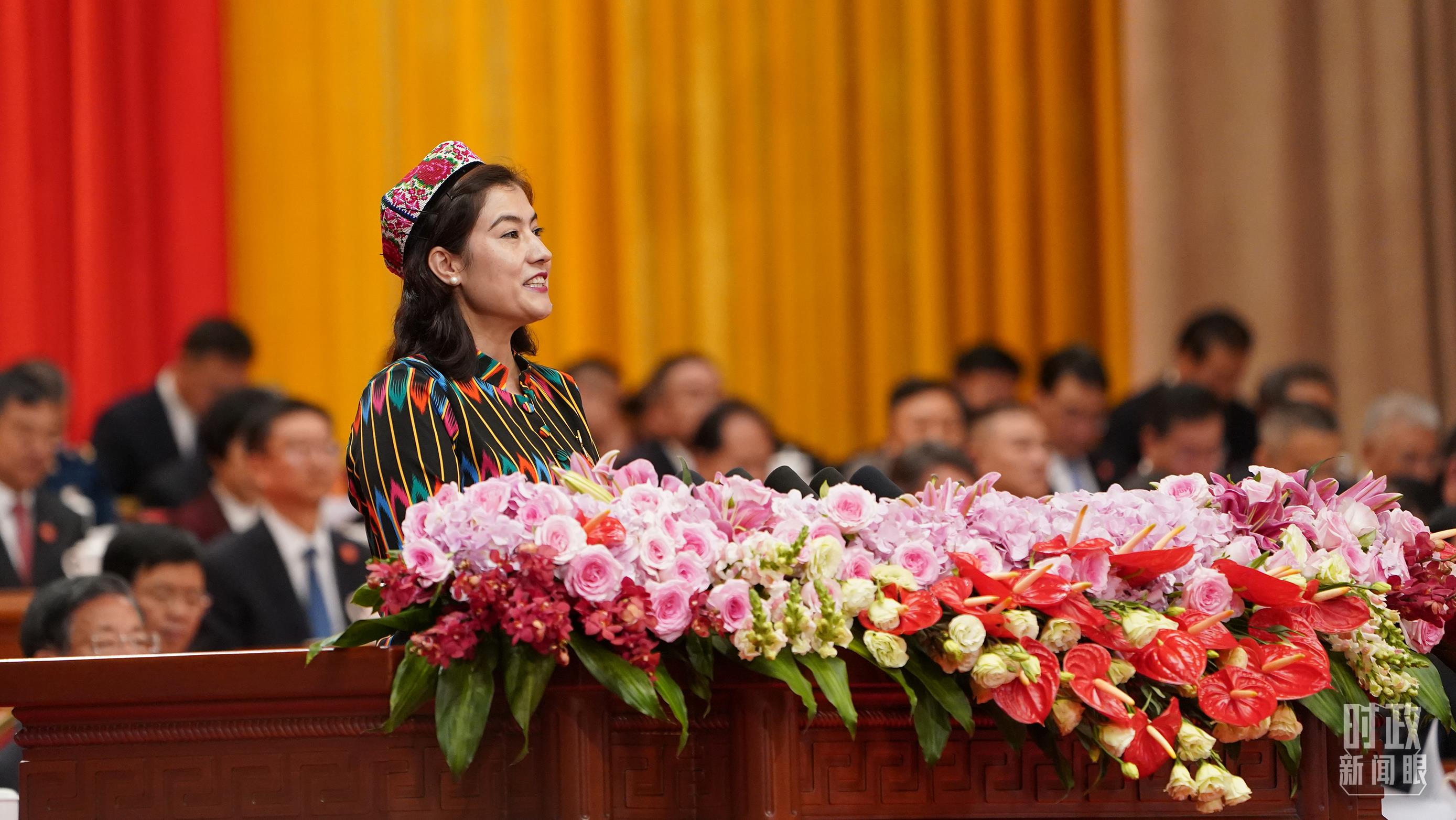 艾米拉古麗·阿不都在慶祝大會(huì)上發(fā)言。(總臺(tái)記者李晉拍攝)