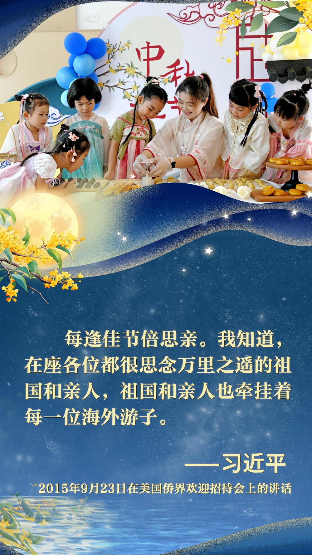 2015年9月23日,中秋佳節(jié)前夕,習(xí)近平總書(shū)記在西雅圖出席美國(guó)僑界歡迎招待會(huì)。他為參加招待會(huì)的同胞們帶去了來(lái)自家鄉(xiāng)的月餅,并熱情地“歡迎大家常回家看看”。