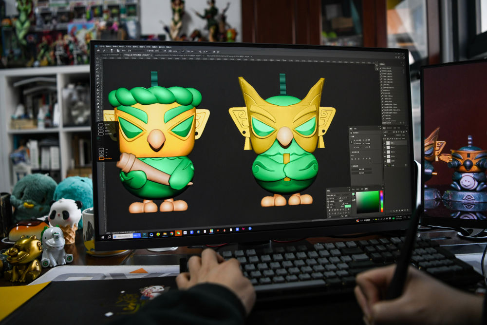 2025年3月1日,文創(chuàng)產(chǎn)品策劃運營師曾舟在位于四川成都的辦公室內完善文創(chuàng)產(chǎn)品細節(jié)。他以三星堆青銅神樹、青銅縱目面具、青銅獸面等文物為創(chuàng)作藍本,結合潮玩元素設計的文創(chuàng)作品廣受歡迎?!拔蚁胱龅牟皇峭婢呖煜?,而是有內容、有溫度、有意義的文化IP,讓年輕一代隨手摸到沉淀千年的文化?!痹壅f。