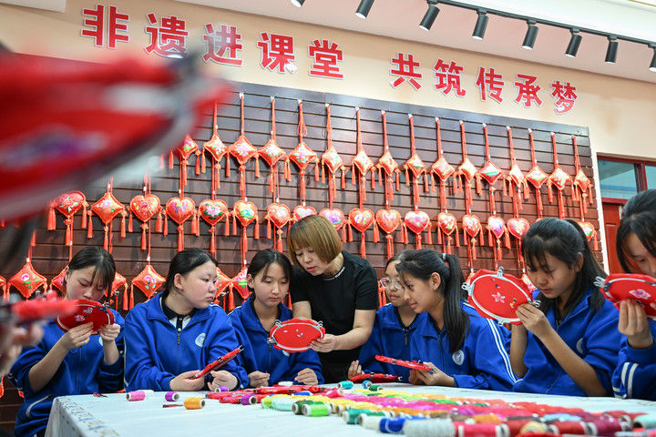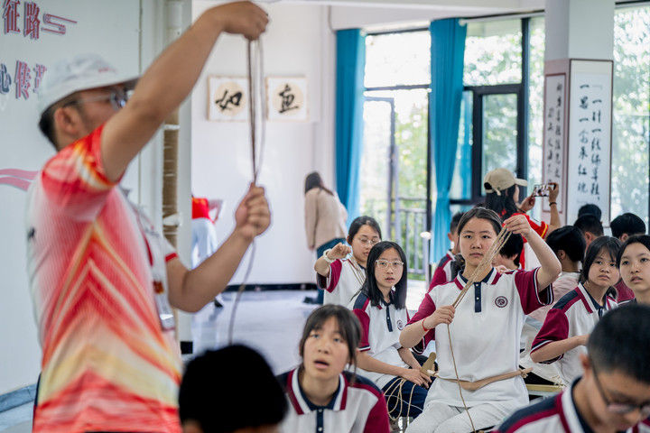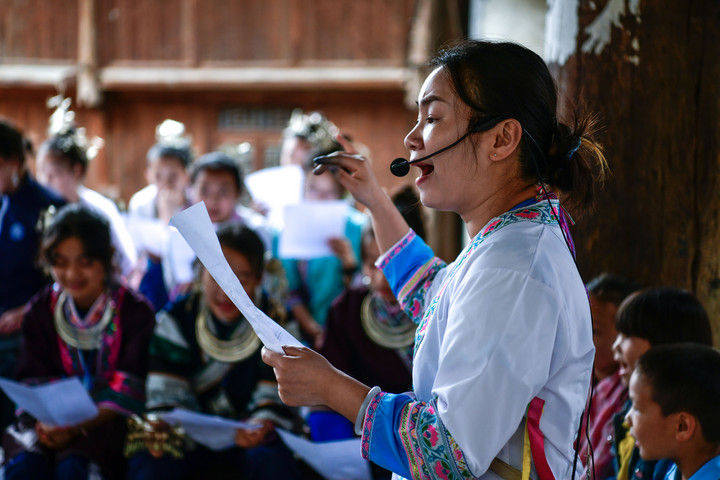 2025年9月26日,內(nèi)蒙古興安盟科右中旗巴彥呼舒第六中學(xué)美術(shù)教師、非遺代表性傳承人吳斯琴(左四)指導(dǎo)學(xué)生刺繡。近年來,內(nèi)蒙古興安盟科爾沁右翼中旗巴彥呼舒第六中學(xué)將當(dāng)?shù)貒?guó)家級(jí)非遺圖什業(yè)圖刺繡引入校園,開設(shè)校本課程,并成立興趣社團(tuán),在豐富校園文化生活的同時(shí),讓學(xué)生們近距離感受非遺的魅力,弘揚(yáng)和傳承中華優(yōu)秀傳統(tǒng)文化。隨著國(guó)產(chǎn)動(dòng)畫電影《哪吒之魔童鬧海》不斷刷新中國(guó)影史票房紀(jì)錄,參與電影配樂的貴州省榕江縣三寶侗寨的楊想妮和“舞樂蟬歌”團(tuán)隊(duì)為更多人所熟知。樂團(tuán)成員懷揣“用音樂傳遞侗族文化,讓世界聽見侗族大歌”的共同夢(mèng)想,將侗族大歌推向更廣闊的舞臺(tái)。這是2025年4月22日,楊想妮在貴州省黎平縣肇興鎮(zhèn)廈格侗寨教前來研學(xué)的孩子們唱侗歌。
