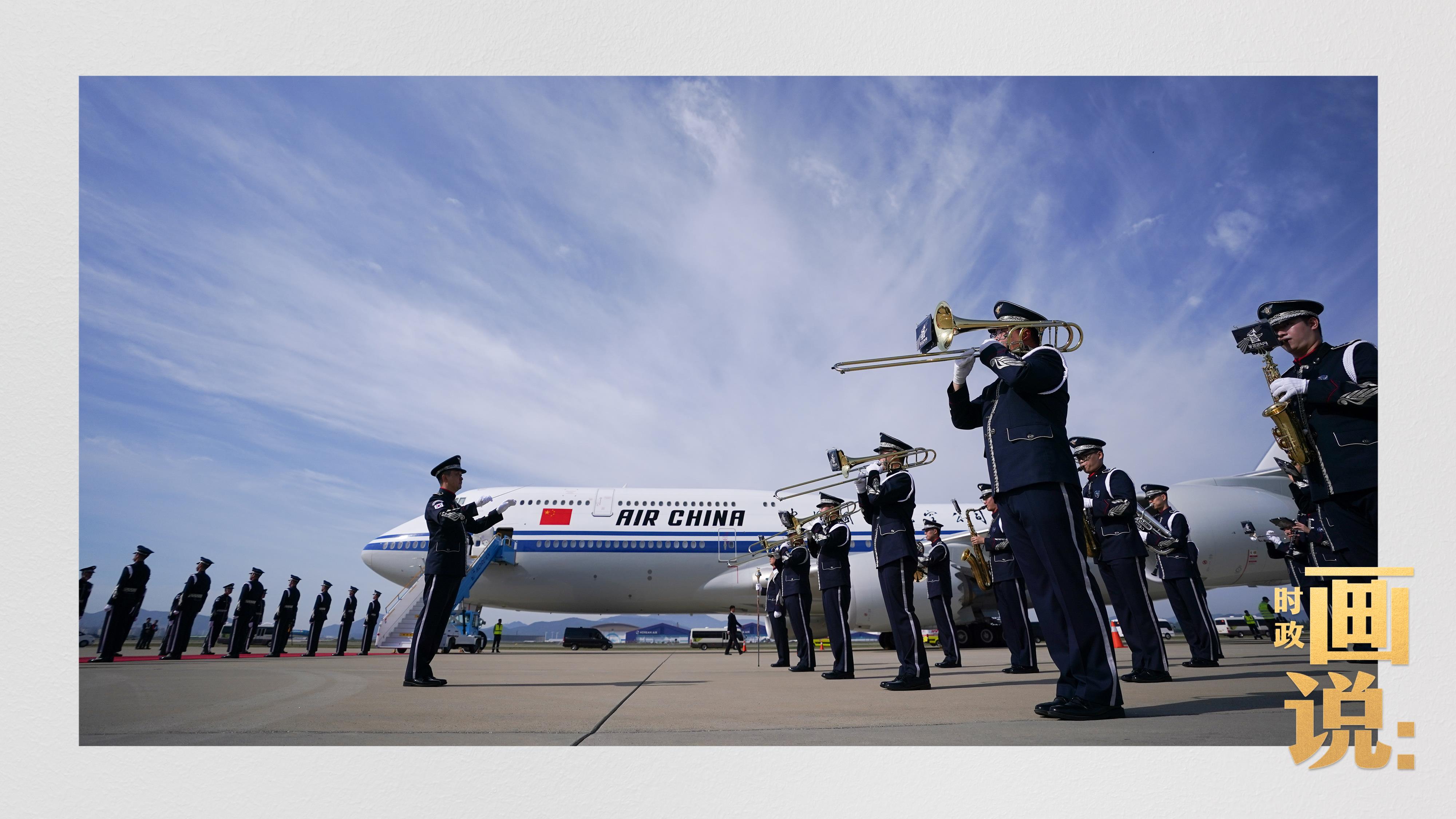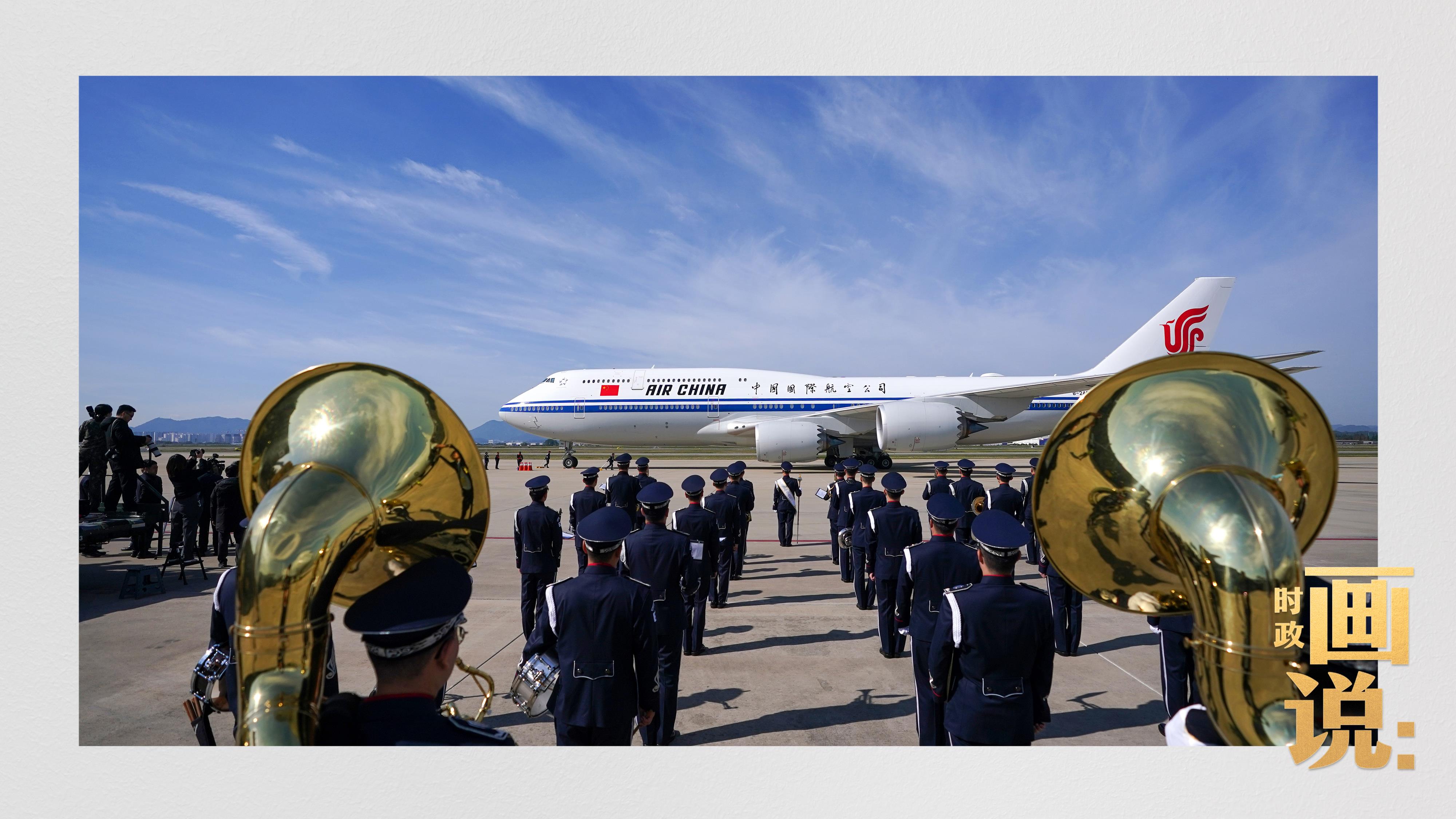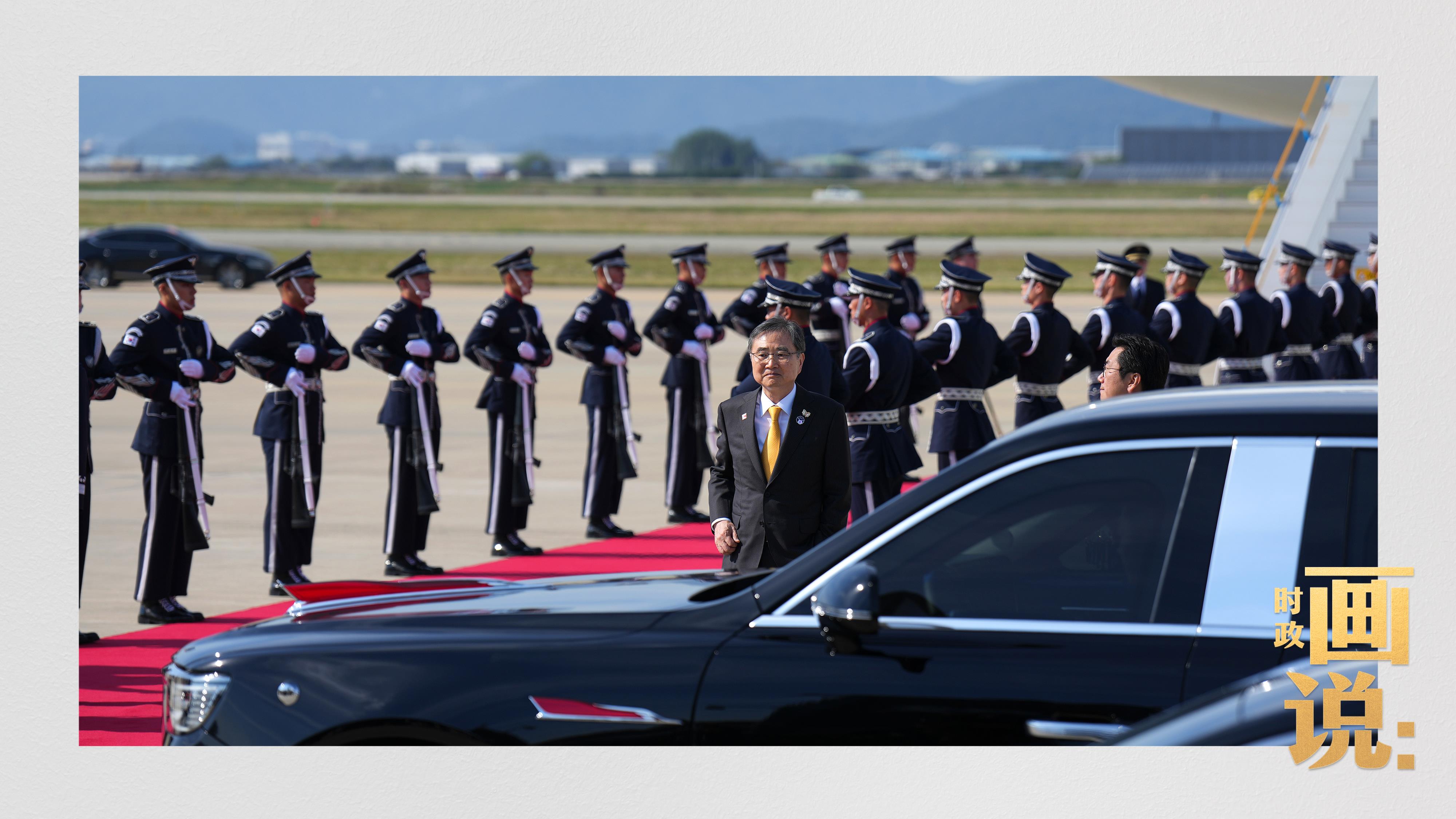 習(xí)近平抵達(dá)釜山金海國際機場時,韓國外長趙顯等高級官員熱情迎接。禮兵分列紅地毯兩側(cè)致敬,軍樂團演奏行進(jìn)樂,機場鳴放21響禮炮。