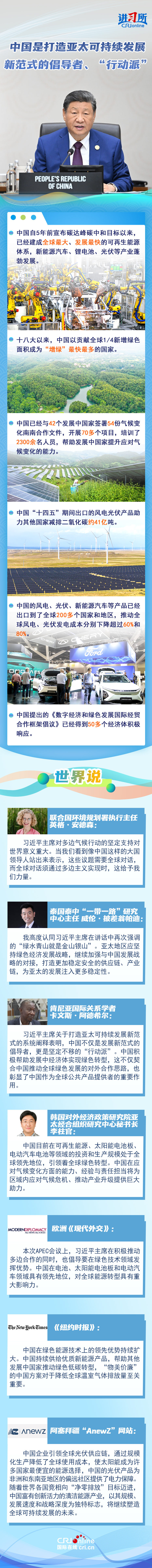 “我們要本著對子孫后代負(fù)責(zé)的態(tài)度,加強(qiáng)各經(jīng)濟(jì)體綠色發(fā)展戰(zhàn)略對接,促進(jìn)優(yōu)質(zhì)綠色技術(shù)和產(chǎn)品自由流通,加快推動發(fā)展方式綠色低碳轉(zhuǎn)型,積極應(yīng)對氣候變化?!?1月1日,中國國家主席習(xí)近平在亞太經(jīng)合組織第三十二次領(lǐng)導(dǎo)人非正式會議第二階段會議講話中提出,要堅持綠色低碳,打造亞太可持續(xù)發(fā)展新范式。
