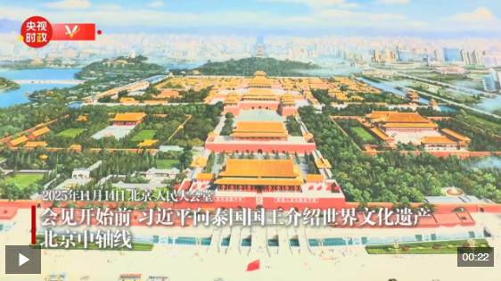 會見開始前,習近平向泰國國王介紹世界文化遺產——北京中軸線。
