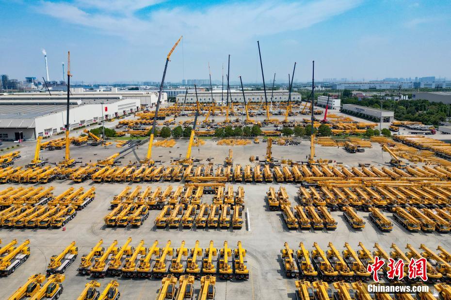 資料圖:徐工集團(tuán)生產(chǎn)車間外停放的起重機(jī)。(無人機(jī)照片)泱波 攝