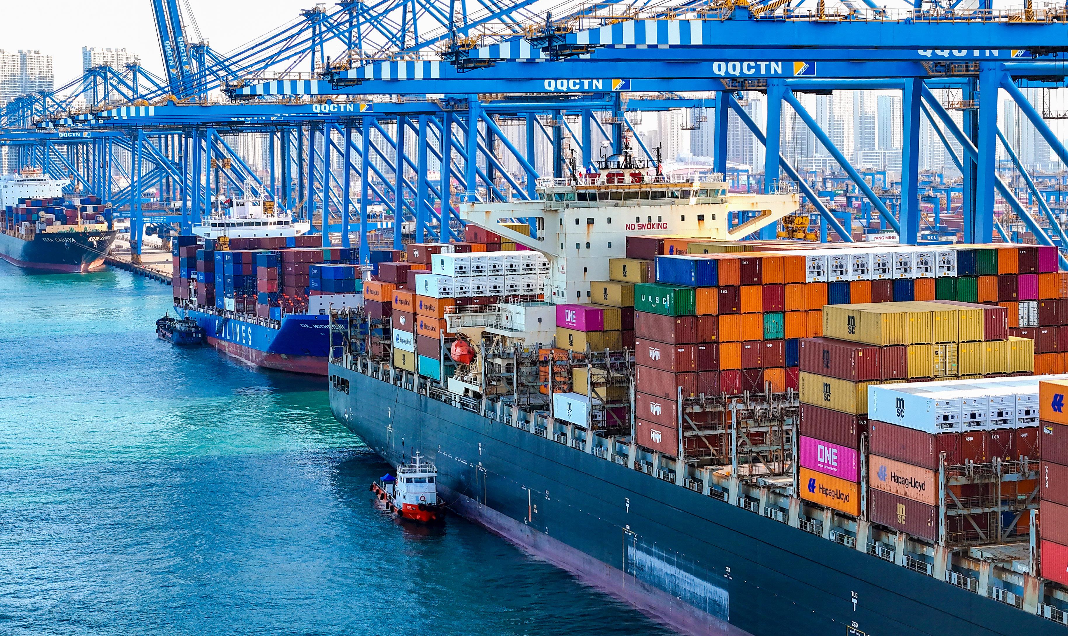 △貨輪在山東港口青島港全自動(dòng)化碼頭裝卸貨物。