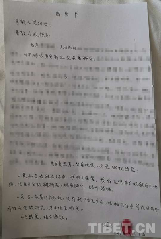 住院期間,索南吉的身份就是病人,對這個未知的疾病難免害怕,好的和不好的結(jié)局,她都反復想到了。作為一名參加過2003年非典和2010年甘肅舟曲特大泥石流一線救治工作的醫(yī)務工作者、有13年黨齡的共產(chǎn)黨員,她在住院的第2天,便向護士借來了筆和紙,在床頭向醫(yī)院鄭重寫下了請愿書:“一是如果我配合治療,戰(zhàn)勝了病魔,我將無償捐獻自己(的)血清,供醫(yī)療實驗研究。二是萬一病魔打倒了我,我將獻出自己身體,供相關(guān)醫(yī)療單位(開展)具有針對性的實驗研究,盡早攻克(新冠肺炎治療的)難關(guān)?!?/p>