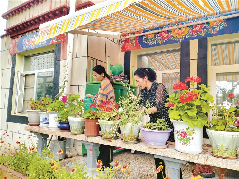 圖為德慶卓嘎和女兒正在澆花。記者 莫瑞英 攝