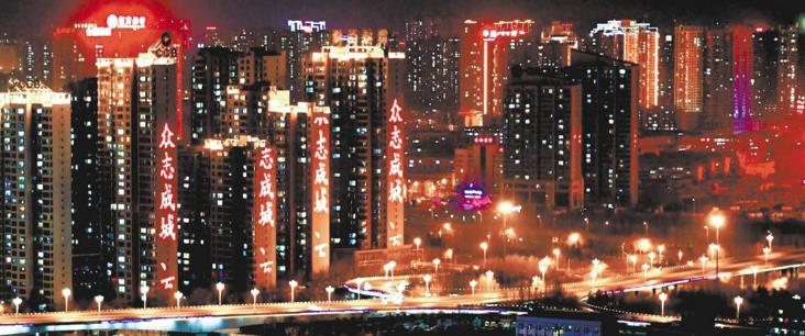 2020年2月8日晚,西寧部分樓體亮起了“眾志成城,抗擊疫情,人人有責(zé)”等抗擊疫情的字幕。記者 祁國彪 攝