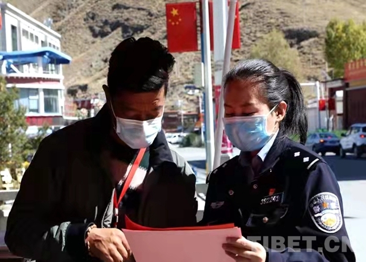 “出家門,戴口罩,少聚會(huì),少串門,非常時(shí)期要留神。勤洗手,講衛(wèi)生,室內(nèi)開窗多通風(fēng)。舊口罩,要收起,有害垃圾要處理……”民警珠央正在使用漢藏雙語(yǔ)向駐地群眾宣講防疫口訣。