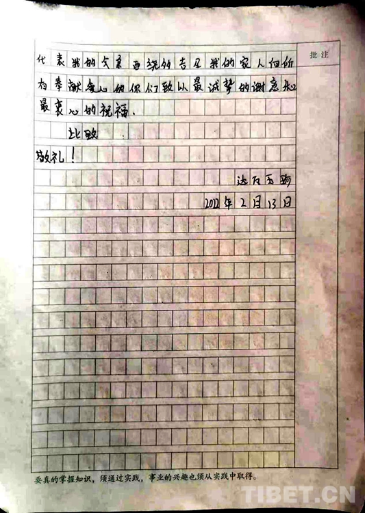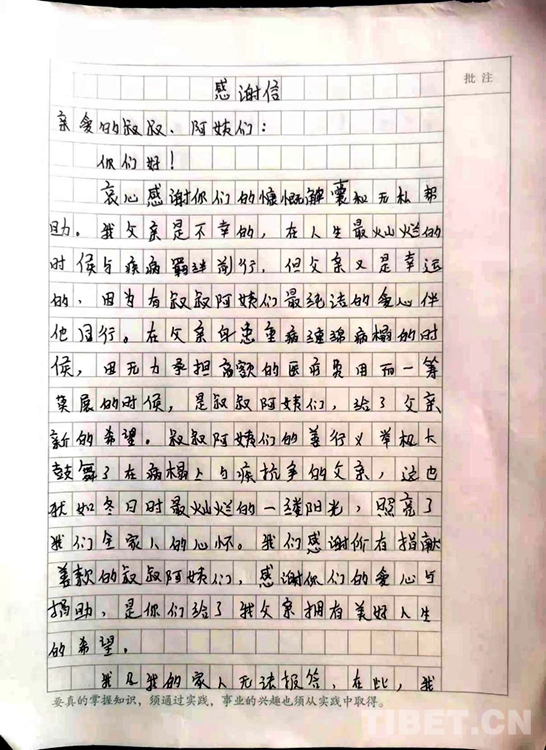 中國(guó)西藏網(wǎng)訊 “親愛的叔叔、阿姨們,您們好,衷心感謝你們的慷慨解囊和無私幫助......!”近日,西藏自治區(qū)林芝市巴宜區(qū)更章門巴民族鄉(xiāng)(以下簡(jiǎn)稱:更章鄉(xiāng))門仲村村民西繞多吉女兒達(dá)娃玉珍向更章鄉(xiāng)新時(shí)代文明實(shí)踐所發(fā)來了一封感謝信,字里行間充滿著感激之情,而背后的暖心故事更讓人溫暖與感動(dòng)。