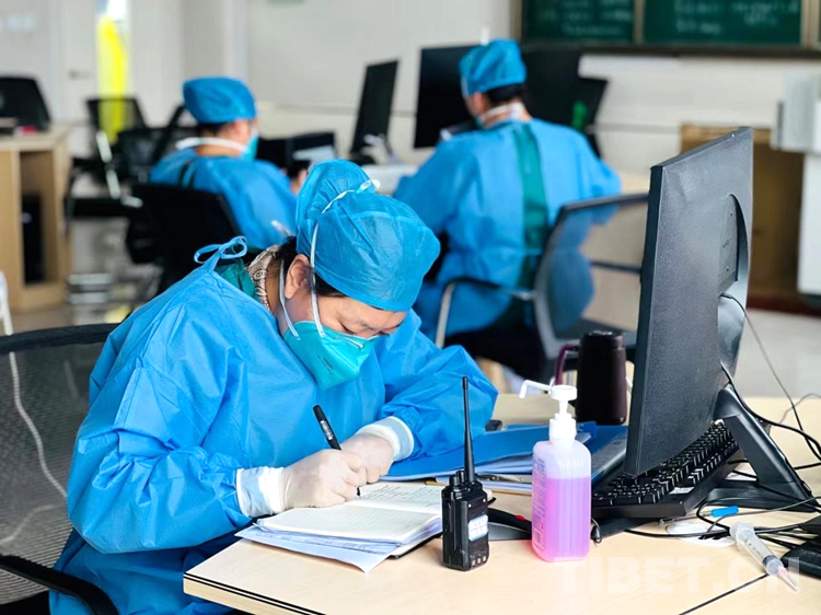 圖為拉薩市第二座方艙醫(yī)院護理隊隊長央宗在記錄一天的重點工作 攝影:次仁卓瑪
