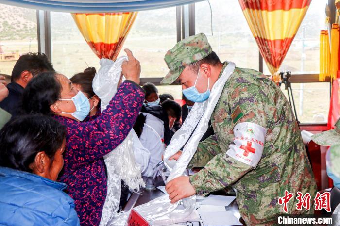 圖為村民紛紛為醫(yī)療隊軍醫(yī)敬獻哈達?!≈煳男?攝