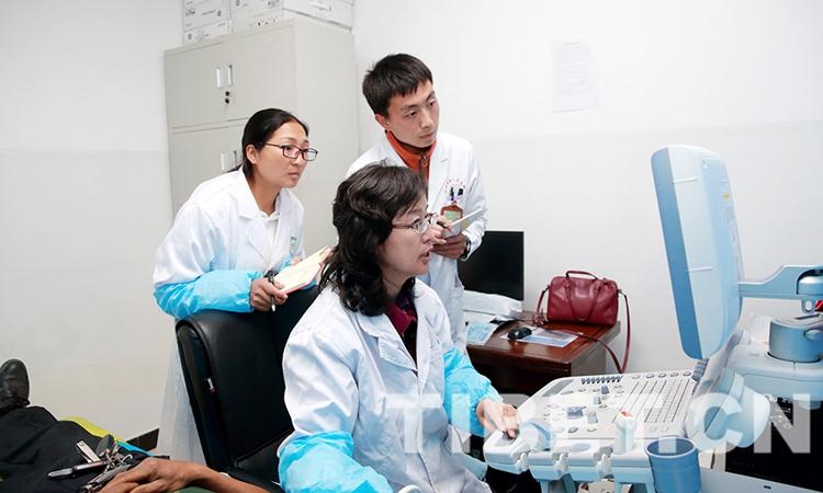 首都醫(yī)科大學(xué)附屬北京天壇醫(yī)院超聲科的何銀鳳給當(dāng)?shù)氐尼t(yī)護(hù)人員演示超聲檢查基本操作。攝影:陳衛(wèi)國(guó)