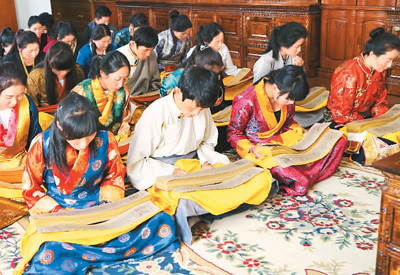 西藏藏醫(yī)學(xué)院的學(xué)生正在研讀記載著藏醫(yī)藥浴法相關(guān)知識的《四部醫(yī)典》。劉罡攝中國非物質(zhì)文化遺產(chǎn)保護(hù)中心供圖