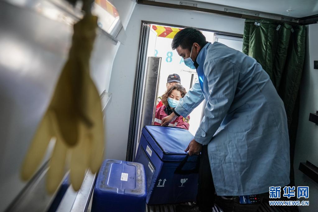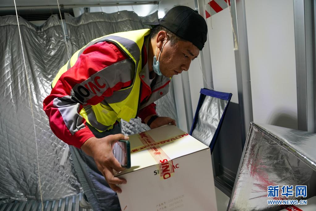 7月22日,蘆艷會在冷鏈車內(nèi)將疫苗搬出,準(zhǔn)備交付給四川甘孜州疾控中心。新華社記者 陳鐘昊 攝