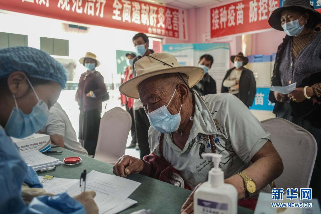 7月24日,在四川甘孜州稻城縣疫苗接種點(diǎn),當(dāng)?shù)厝罕娫诮臃N疫苗。新華社記者 彭子洋 攝
