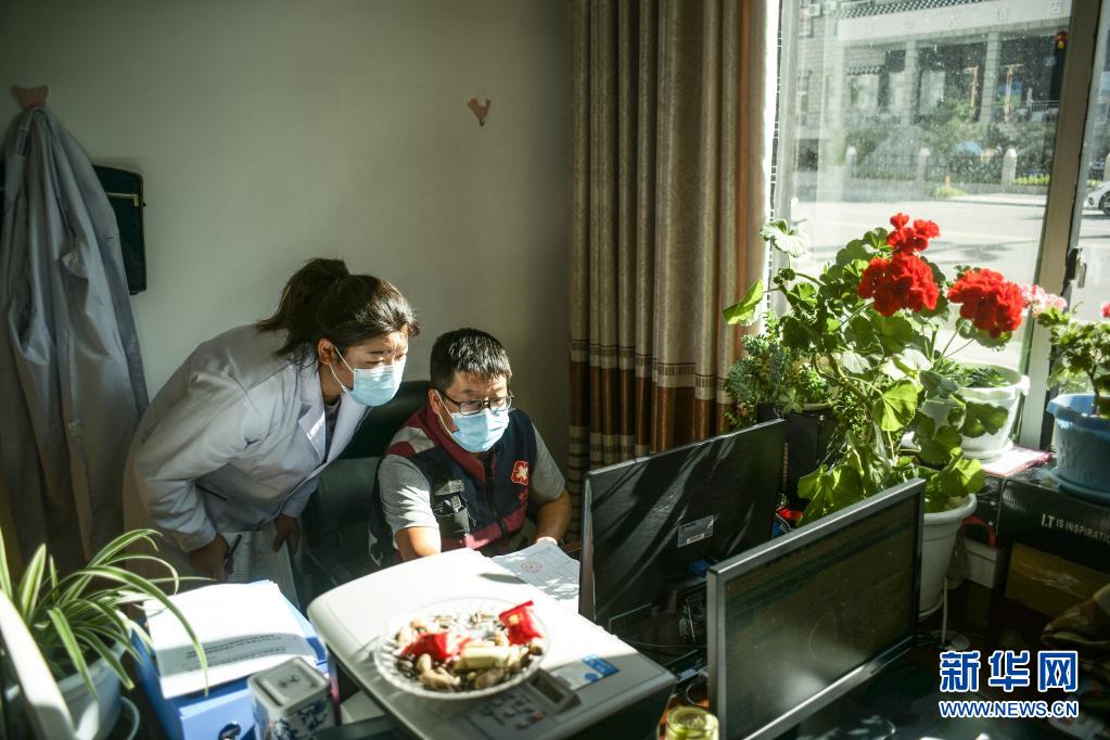 7月23日,四川甘孜州疾控中心工作人員黃亮(右)在稻城縣疾控中心與當(dāng)?shù)毓ぷ魅藛T對接疫苗信息。新華社記者 彭子洋 攝