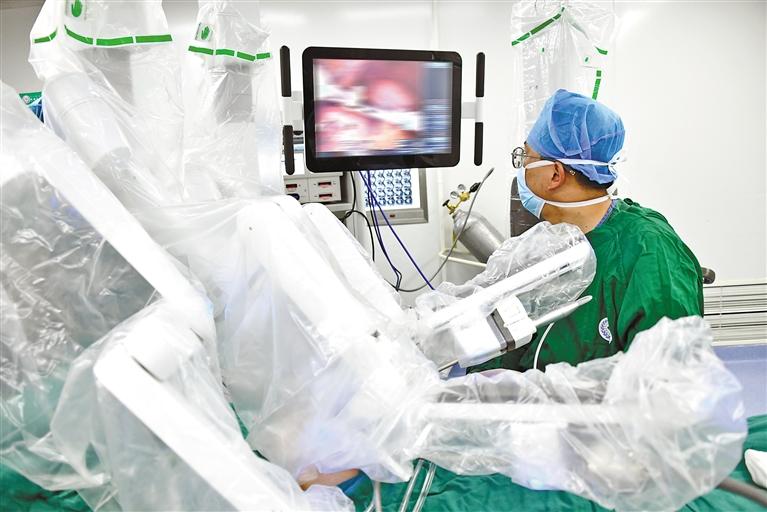 圖為自治區(qū)人民醫(yī)院普通外科主任巴桑頓珠運用第四代手術(shù)機器人開展外科手術(shù)。