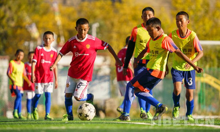 圖為2021年全國青少年體育冬夏令營進(jìn)校園活動(西藏站)閉營儀式上,學(xué)生們正在進(jìn)行足球比賽 攝影:趙耀