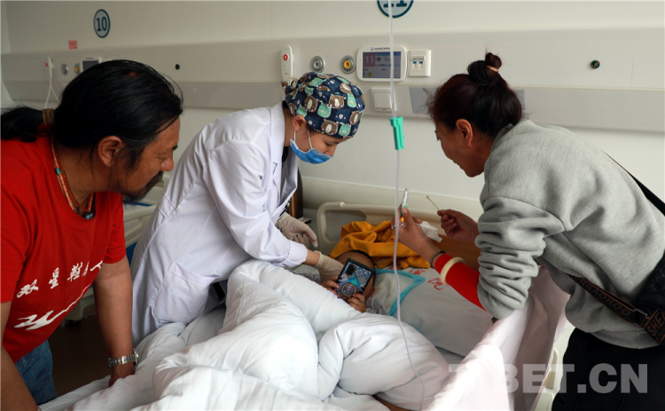圖為中國醫(yī)學(xué)科學(xué)院整形外科醫(yī)院唇腭裂整形科博士研究生正在為來自青海省果洛藏族自治州的患兒進行手術(shù)后護理 攝影:劉莉