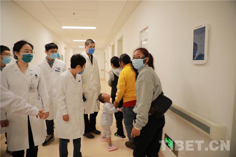 圖為來自青海省果洛藏族自治州的患兒卓瑪(化名)和措姆(化名)在家屬的陪同下出發(fā)前往手術(shù)室途中與正在查房的唇腭裂整形科醫(yī)生們相遇 攝影:劉莉