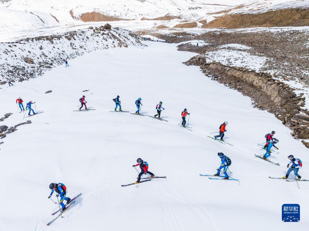 在西藏拉薩市當(dāng)雄縣羊八井鎮(zhèn),玉珍拉姆(前排左二)和隊友進(jìn)行滑雪登山訓(xùn)練(5月2日攝,無人機(jī)照片)。新華社記者 孫非 攝