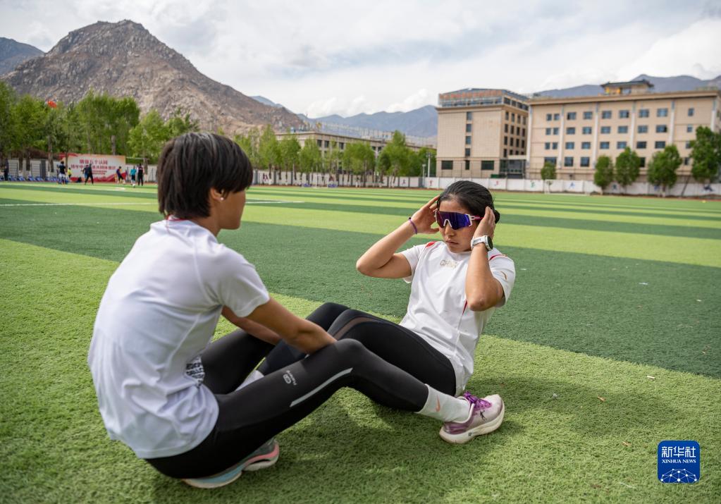 在西藏自治區(qū)體育運(yùn)動技術(shù)學(xué)校,玉珍拉姆(左)和隊友次旦玉珍在訓(xùn)練后聊天(4月29日攝)。新華社記者 孫非 攝