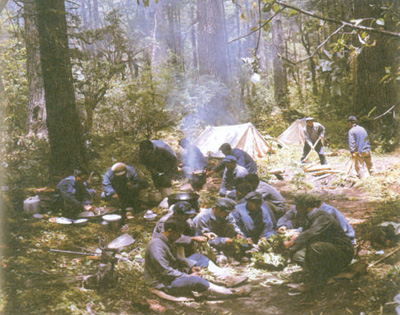 圖為書中插圖:考察隊(duì)員在林間宿營地做早餐。