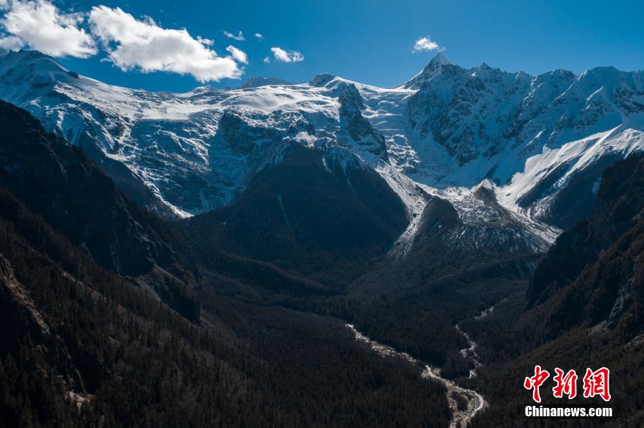 圖為蔥郁森林與皚皚雪山交相輝映。何蓬磊 攝