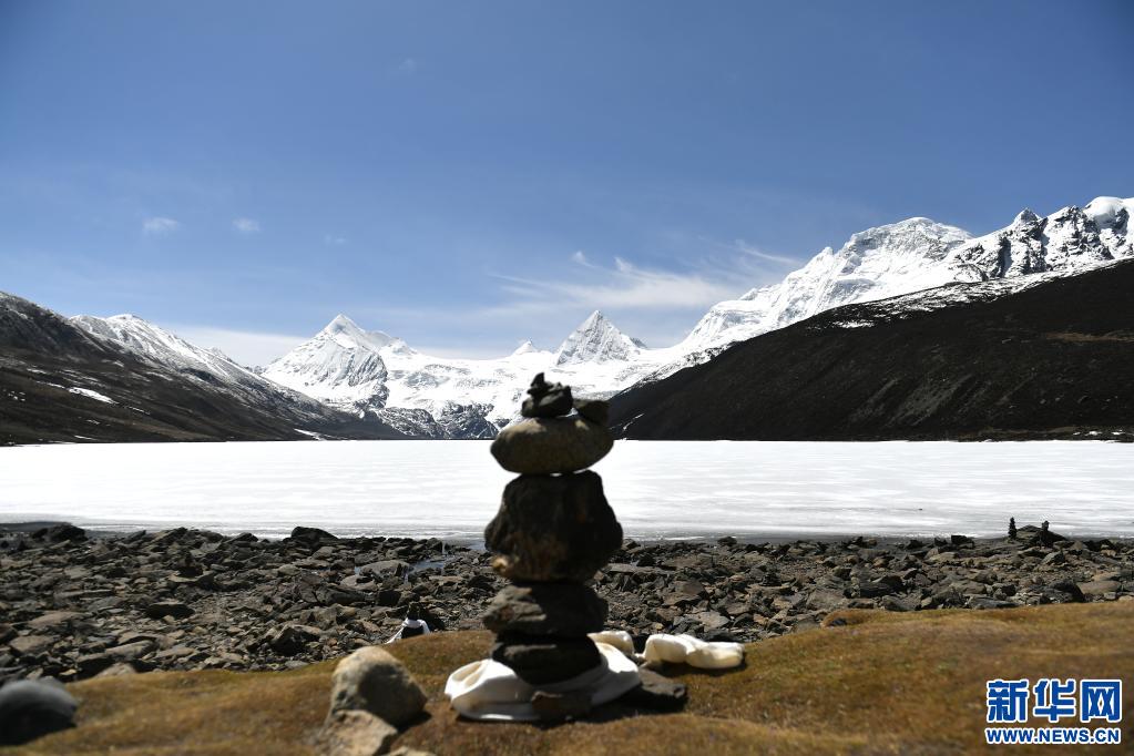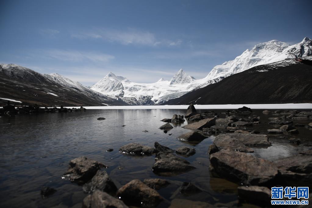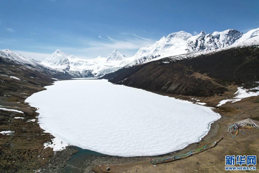 這是5月4日拍攝的薩普雪山和雪山腳下的冰湖(無人機照片)。新華社記者 孫瑞博 攝