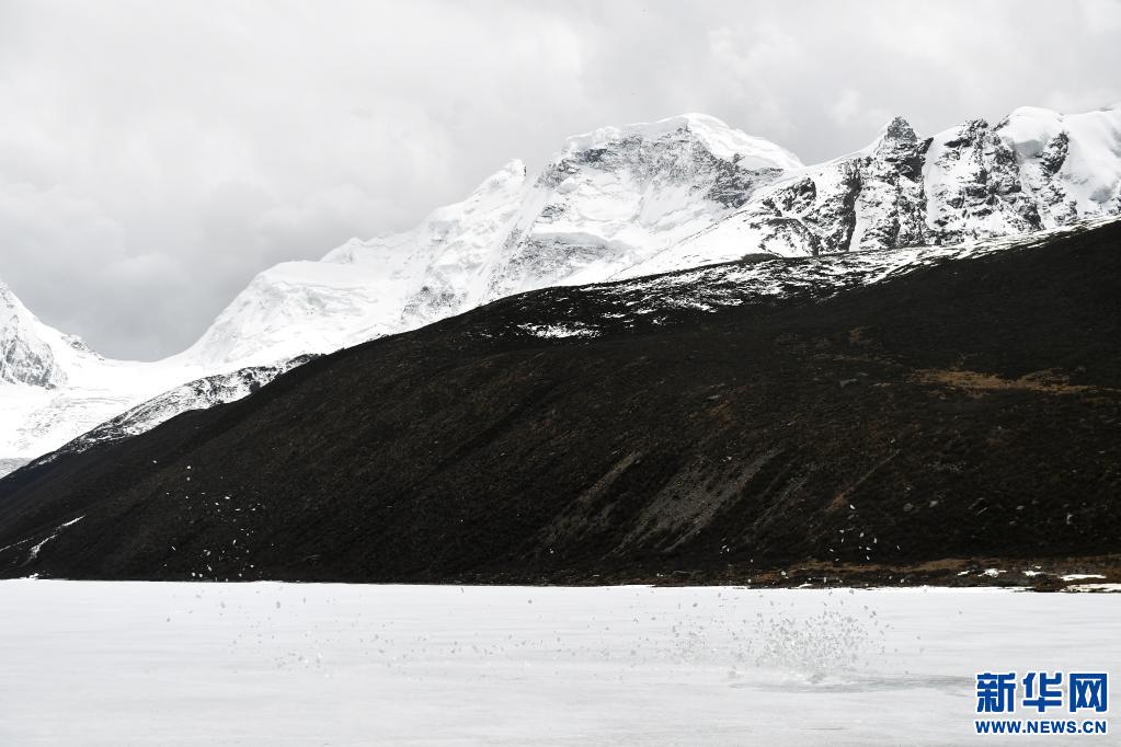 一陣強風掠過薩普雪山腳下的冰湖時卷起湖面的薄冰(5月4日攝)。新華社記者 孫瑞博 攝