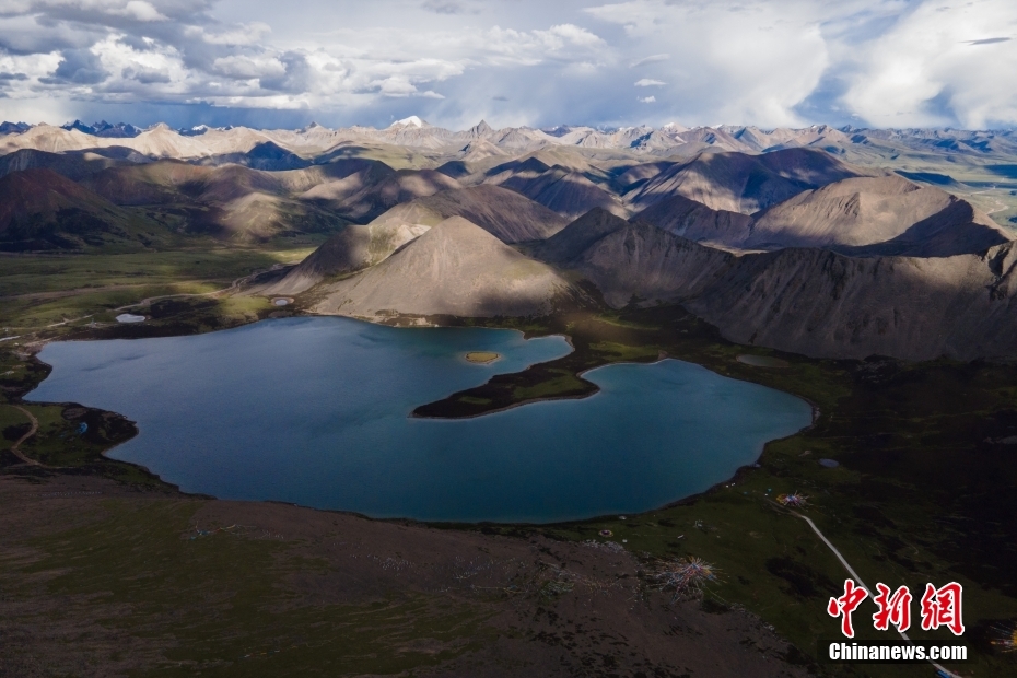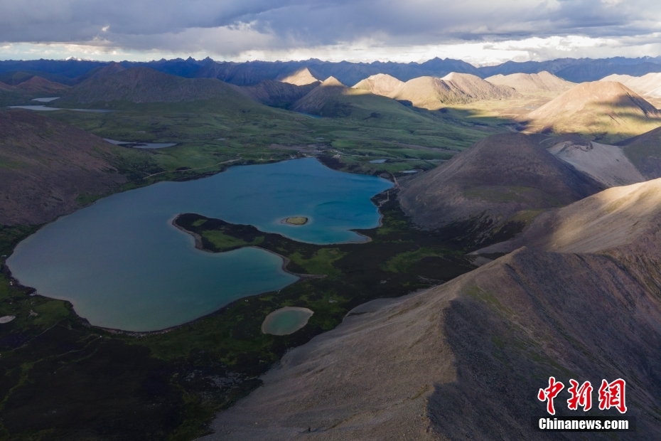 6月23日,思金拉措湖邊高原山脈風(fēng)光。思金拉措位于西藏墨竹工卡縣日多鄉(xiāng),海拔4500多米,周邊群峰簇擁,地形猶如聚寶盤,不少民眾將其稱為西藏的“財神湖”。(無人機照片) 中新社記者 江飛波 攝