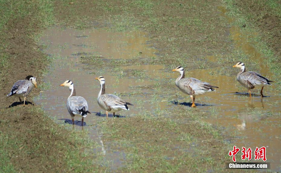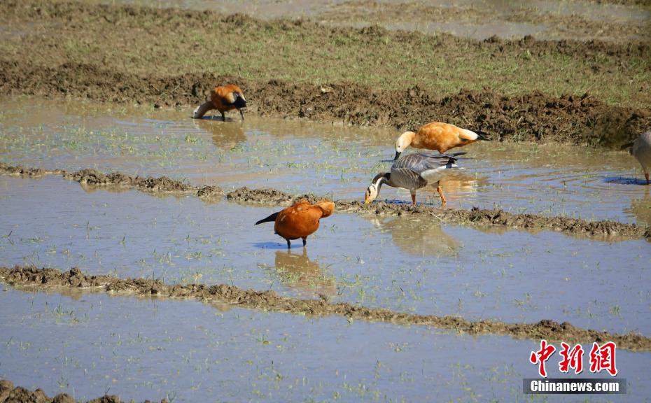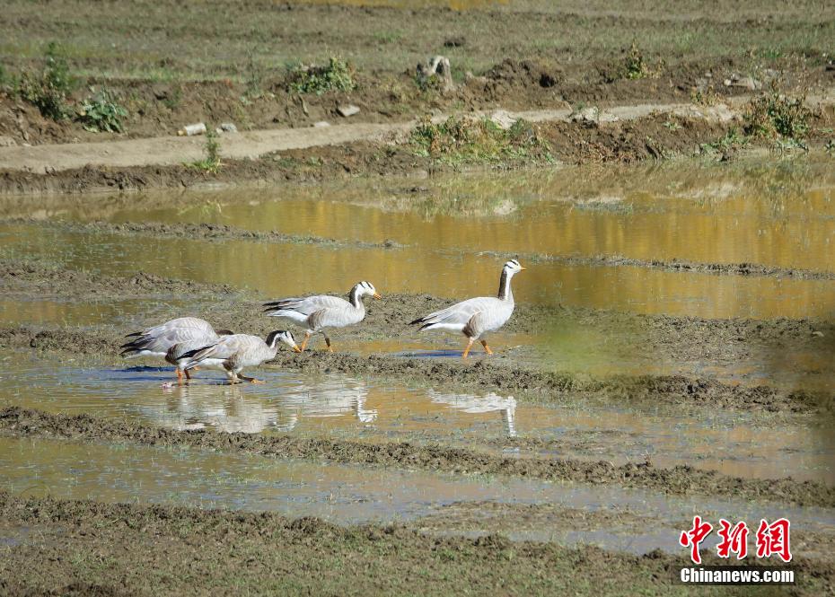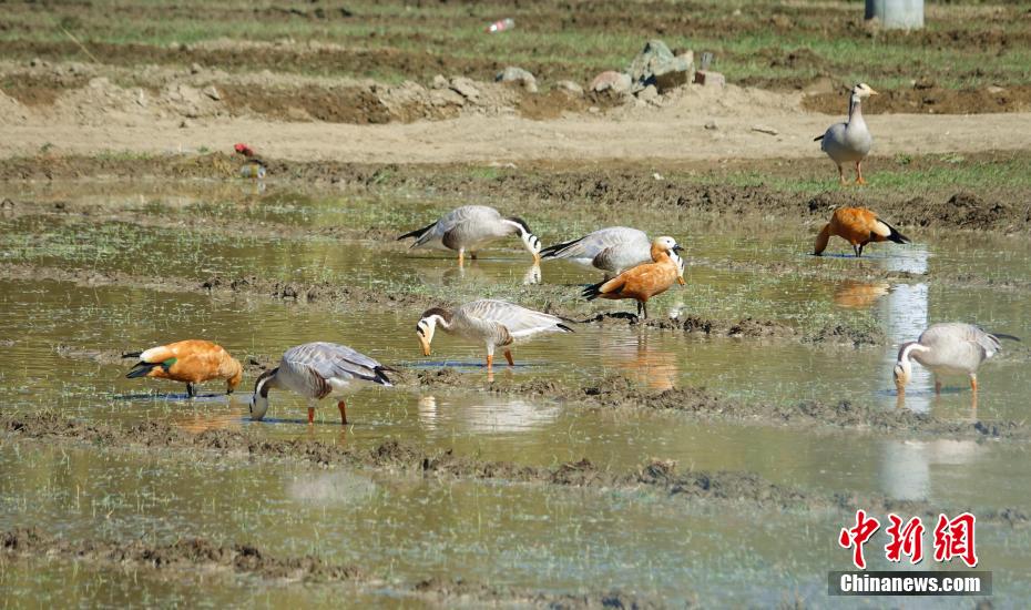 圖為11月12日,斑頭雁、赤麻鴨等鳥類在西藏山南市扎囊縣境內的農田內漫步。冉文娟 攝
