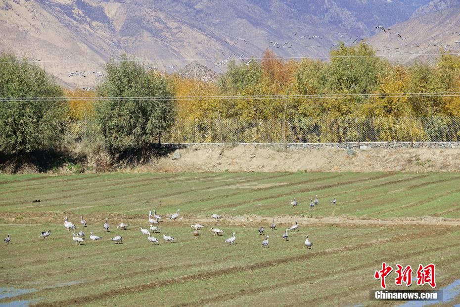 圖為11月12日,斑頭雁等鳥類在西藏山南市扎囊縣境內的農田覓食。冉文娟 攝