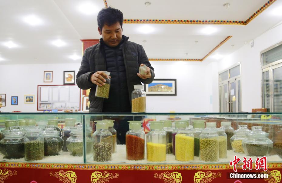 12月8日,青海省黃南藏族自治州尖扎縣,五谷畫藝人索南本查看農(nóng)作物儲存狀況。青稞、小麥、各式油菜籽等農(nóng)作物經(jīng)挑選、排列組合,“變身”精美的“尖扎五谷畫”。2007年,該縣藝人索南本開始創(chuàng)作藏式風格五谷畫,摸索防臭、防蟲、防潮、裝裱等步驟,并在當?shù)亻_展培訓,帶領殘疾、困難民眾進行創(chuàng)作,憑雙手致富。 中新社記者 馬銘言 攝