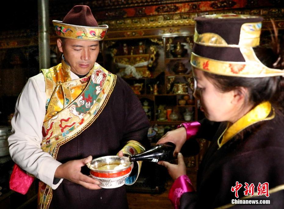 11月24日恰逢藏歷十月初一,西藏林芝迎來2023年工布新年,這是西藏最早的新年。工布新年以其悠久的歷史、鮮明的特色、豐富的內(nèi)涵,于2006年被列入第一批西藏自治區(qū)非物質(zhì)文化遺產(chǎn)保護(hù)名錄。圖為村民向客人敬酒。 阿仁 攝