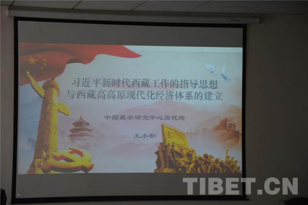 圖為王小彬作題為《習(xí)近平新時代西藏工作的指導(dǎo)思想與西藏高高原現(xiàn)代化經(jīng)濟體系的建立》的報告。
