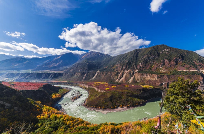 秋季的大峽谷由夏季單一的蔥蘢碧綠轉(zhuǎn)向秋季的五色斑斕。金色的松林、抬眼可見的冰川雪山,湛藍(lán)澄澈的天空,當(dāng)這一切倒映在碧綠的江水中,仿佛一幅生動(dòng)的油畫。