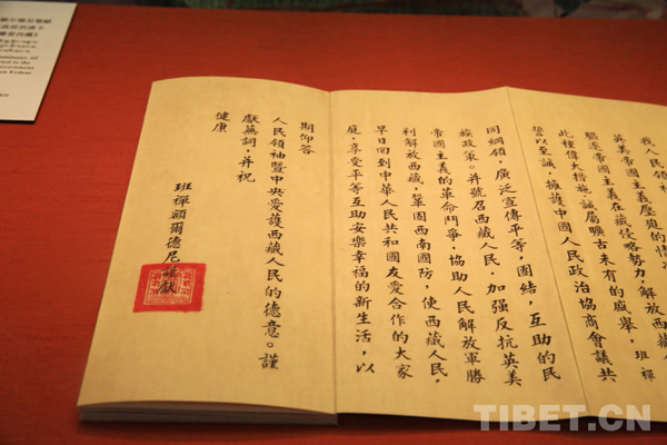 圖為十世班禪額爾德尼敬獻毛主席的獻詞,民族文化宮博物館藏。