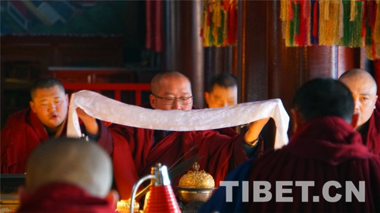 圖為僧人端坐于宗喀巴大師像兩側誦經(jīng)。